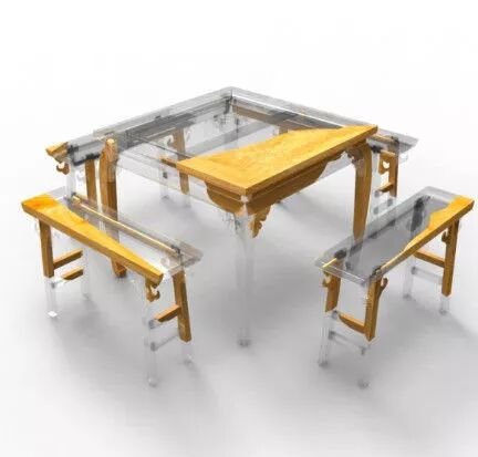 亚克力作为现代人工合成材料,期透、坚硬的肌理特性与木材带给人的素雅、温润的视觉感受相结合,不仅是两材料的碰撞也是现代工业化、科技与传统木作的完美衔接与融合,一件作品仿佛能够带来古今两个时代的使用体验,使材料从载体走向自我表达。