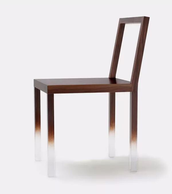 颜色由专门的工匠进行喷涂,椅子腿的下部通过颜色的渐变使其木纹看起来似渐渐隐去。木质的椅背及座面的实体部分使这件家具具有体量感和空间感,椅腿下半部的透明材质则能充分与环境融为一体,使椅子看起来仿佛漂浮在空气之中,令这件作品极具趣味性和设计感。